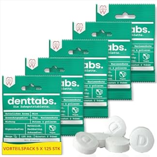 9,51 €Produkt kaufenDenttabs Zahnputztabletten 5×125 Stk für 10 Monate. die vollwertige Alternative zur Zahnpasta, Mint fluoridfrei VEGAN Plastikfrei ohne Konservierungsstoffe. Im Orginal denttabs kompostierbaren Beutel