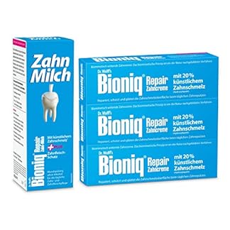 25,96 €Produkt kaufenBioniq® Repair-Zahncreme Zahnfleisch-Schutz, 3 x 75 ml & Zahn-Milch im Set, 1 x 400 ml – Zahnpasta mit Hydroxylapatit und Zahnfleisch-Schutz und reparierende Mundspülung – ohne Fluorid