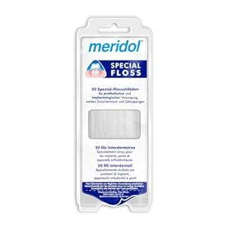 9,98 €Produkt kaufenmeridol Zahnseide Special Floss, 1 x 50 Stück – zur Reinigung weiter Zahnzwischenräume, geeignet für Träger von Brücken, Kronen und Implantaten