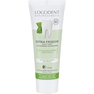 6,09 €Produkt kaufenLOGODENT Naturkosmetik EXTRA FRISCHE daily care Pfefferminz Zahncreme, Mit Bio-Kamille und Bio-Pfefferminzöl, Zur Gesunderhaltung des Zahnfleisches, Vegan, 1 x 75ml
