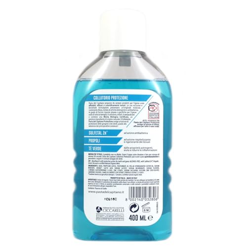 Captain’s Paste Fresh Breath Mouthwash – Protected Gums, mittels einer sanften Gebrauchsanweisung, trägt zu frischem Atem benachbart und schützt das Zahnfleisch durch der Anwesenheit von: Propolis, antibakteriell mittels revitalisierender und geweberegenerierender Wirkung; Grüner Tee mittels adstringierenden und antioxidativen Eigenschaften; Triclosan, das hilft, Plaque vorzubeugen; Natriumfluorid, dessen Fluoridionen den Zahnschmelz anspornen und so zur Verwehrung von Karies beitragen.