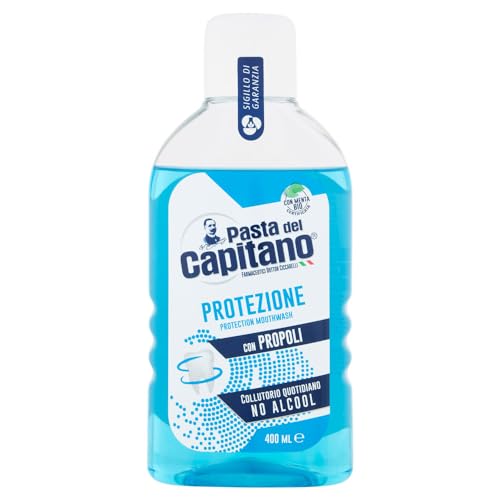 Captain’s Paste Fresh Breath Mouthwash – Protected Gums, durch einer sanften Schema, trägt zu frischem Atem angrenzend und schützt das Zahnfleisch mit Bezug auf der Anwesenheit von: Propolis, antibakteriell durch revitalisierender und geweberegenerierender Wirkung; Grüner Tee durch adstringierenden und antioxidativen Eigenschaften; Triclosan, das hilft, Plaque vorzubeugen; Natriumfluorid, dessen Fluoridionen den Zahnschmelz ins Rollen bringen und so zur Verhinderung von Karies beitragen.