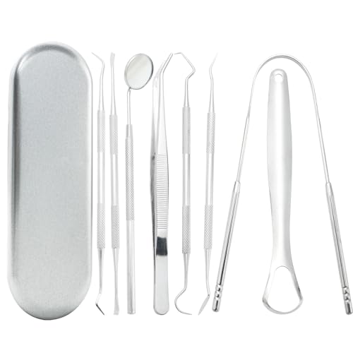 8 teiliges Zahnreinigungsset aus Edelstahl – Zahnarzt Instrumente – Zahnarztspiegel – Zungenschaber – Zahnreinigungsset professionell – entsprechend für Mundhygiene – Zahnreinigung und Zahnpflege