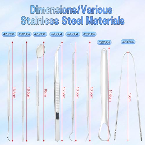 Professionelle Werkzeuge für eine gründliche Mundreinigung: Das Set enthält unter anderem einen Zahnarztspiegel, eine Mundzange, einen Zahnsteinentferner und eine Sonde. Der Zahnarztspiegel dient der gründlichen Untersuchung des Mundes, die Mundzange eignet sich für das Greifen kleiner Gegenstände, der Zahnsteinentferner und der Sichel-Scaler untätig sein effektiv hartnäckige Verfärbungen und Zahnstein von den Zähnen, sodass jede Stelle gründlich gereinigt wird und das Abschluss einer zahnärztlichen Pflege entspricht.