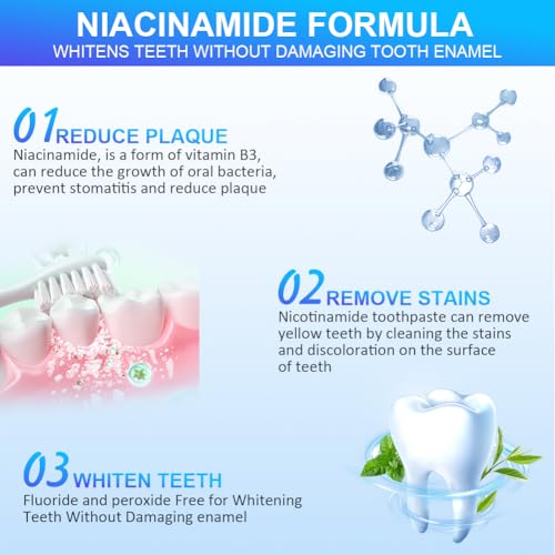 【Niacinamid-Zahnpasta zur Zahnaufhellung】: Die mit Niacinamid-Extrakt angereicherte Niacinamid-Zahnpasta entfernt effektiv hartnäckige Flecken durch Rauch, Tee, Kaffee und Wein und schenkt Ihnen ein strahlendes, selbstbewusstes Lächeln.