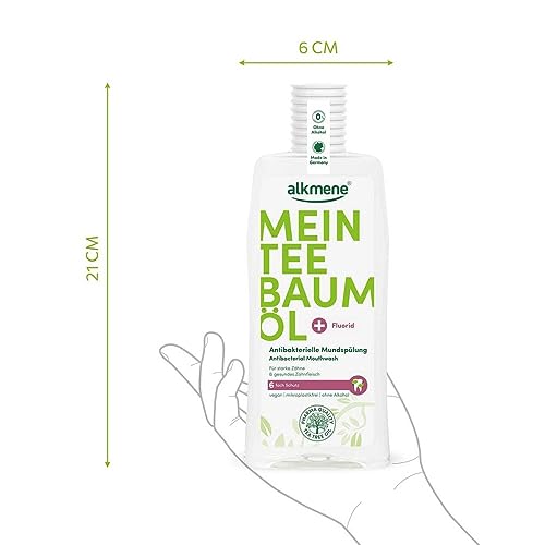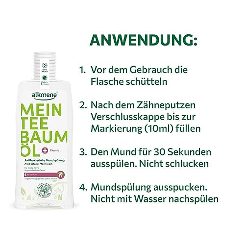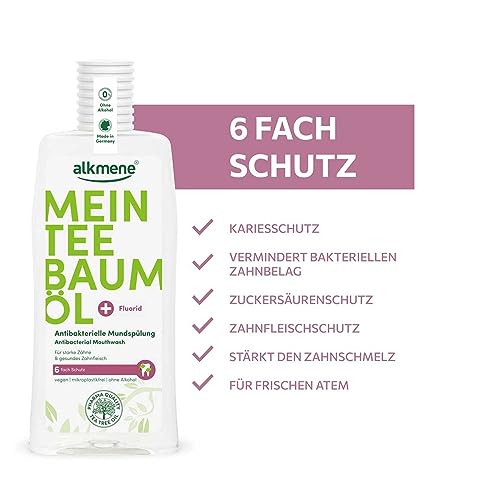 Alkmene Mein Teebaumöl Antibakterielle Mundspülung (Packungsgröße: 500 ml) mit der einzigartigen Wirkkombination allesamt Teebaumöl und Fluorid wirkt 6-fach und kann helfen, Zahnfleischbluten zu vermindern und Entzündungen vorzubeugen.