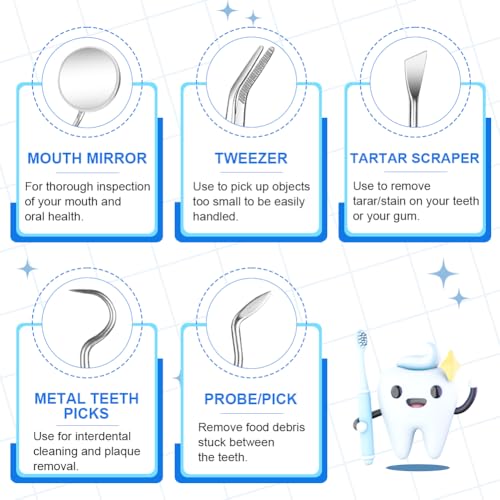 【Anti-Rutsch-Griff】 Alle unsere Werkzeuge sind ergonomisch geformt, um die Betriebssicherheit zu verarbeiten. Sie sind mit Anti-Rutsch-Griffen ausgestattet, um die Reibung und Stabilität während des Betriebs zu erhöhen und Schäden am Zahnfleisch zu vermeiden. Es ist das komplette Mundpflegeset, das Sie brauchen.