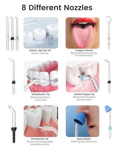 8 Multifunktionsdüsen: Mundduschen hat 8 verschiedene Düsen (3 normale Düsen in verschiedenen Farben an Stelle die Verwendung mit Familienmitgliedern, 1 x Orthodontic-Düse an Stelle Zahnspange, 1 x Parodontalsdüse an Stelle Parodontitis, 1 x Zahnplaquesdüse an Stelle Zahnbelag, 1 x Zungenreinigungsdüse, und 1 Nasenspraydüse.