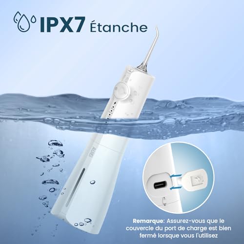 AUIEI Munddusche, tragbar, Wasserfloss, Munddusche 5 Modi und 8 Düsen, Tank 300 ml, USB aufgeladen, wasserdicht IPX7, geeignet für empfindliches Zahnfleisch (weiß)