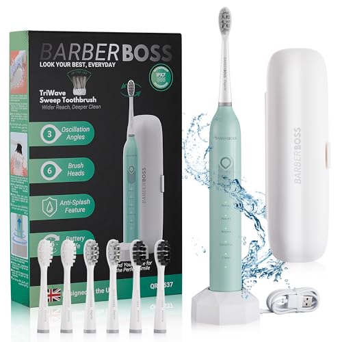 Weltraum-in-One-Mundpflege-Set: Die BarberBoss Sonic elektrische Zahnbürste wird komplett mit wesentlichem Zubehör für eine gründliche Reinigung geliefert – 1 Zahnbürste, 2 normale Bürstenköpfe, 2 Bürstenköpfe für eine verbesserte Reinigung, 2 Bürstenköpfe für eine sanfte Reinigung, 6 hygienische Reisekappen, 1 Ladestation und 1 Reiseetui für Komfort.