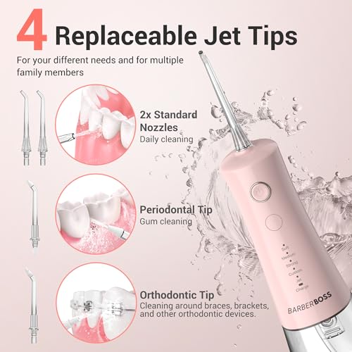 Umfassende Mundpflege mit 4 vielseitigen Düsen: Das BarberBoss munddusche kabellos set enthält 2 Standarddüsen, 1 kieferorthopädische Düse und 1 Parodontaldüse ideal für gründliche Zahnreinigung, Zahnspangen- und Zahnfleischpflege. Die Munddusche Kabellos bietet weil maximale Adaptivität und Komfort bei der täglichen Anwendung.