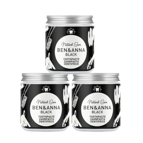 BEN & ANNA Black – Fluoridfreie natürliche Zahnpasta im Glas – Aktivkohle Whitening, Vegan, Natürlicher Minz Geschmack – Zahnpasta in der Dose, Weiße Zähne – 3er Pack