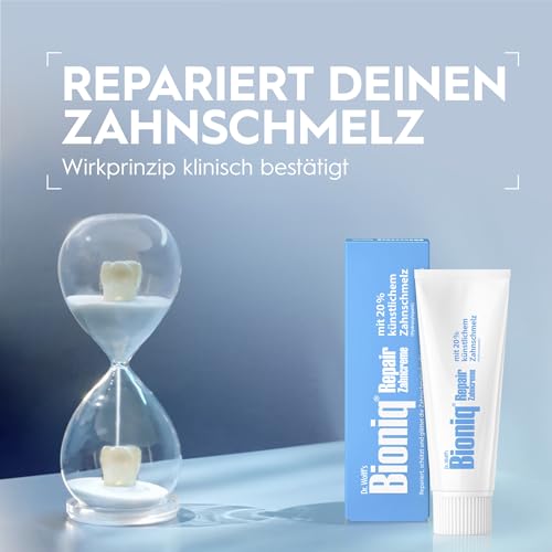 Bioniq Repair-Zahncreme bekämpft das Problem mit Hilfe von künstlichem Zahnschmelz (Hydroxylapatit). Die biomimetischen Kristallite verbinden sich mit der Oberfläche des Zahnschmelzes und zumachen so kleine Defekte. Eine Deckschicht aus künstlichem Zahnschmelz entsteht, die den Zahn vor Demineralisation schützt. Die Zähne fühlen sich glatter an. Durch diesen Abschirmung können Bakterien nicht mehr so gut an der Zahnoberfläche haften.