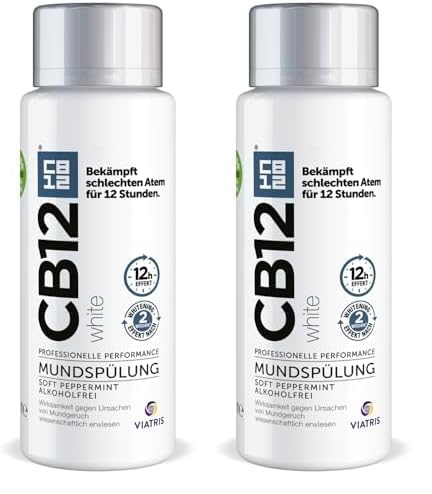 Erhalten Sie einen angenehmen Atem sowie eine zahnaufhellende Wirkung (bei mindestens 2xtäglicher Anwendung über 2 Wochen) mit CB12 White. Hierbei handelt es sich um eine Mundspülung mit sanftem Minzgeschmack, die die Ursache von Mundgeruch bekämpft und einen zahnaufhellenden Effekt hat. Regelmäßiges Geschirr spülen mit einer Mundspülung ist ein grundlegender Bestandteil einer guten Mundhygiene-Alltag – zusammen mit korrektem Zähneputzen inkl. Reinigung der Zahnzwischenräume. Die häufigste Ursache für unangenehmen Atem ist die Ballungsraum von Bakterien im Mund. Diese Bakterien befinden sich zwischen den Zähnen, in den Zahnfleischtaschen und in den Vertiefungen auf der Zunge, vor allem im hinteren Drittel. Sie bilden sogenannte flüchtige Schwefelverbindungen. CB12 White bekämpft Ursache von Mundgeruch (die flüchtigen Schwefelverbindungen), anstatt diesen aber kurzzeitig zu überdecken. Die zwei wichtigsten Wirkstoffe sind Zinkacetat (0,3 Prozent) und Chlorhexidin (0,025 Prozent). Diese synergetisch wirkende Kombination in CB12 White Mundspülung bekämpft die Ursache von Mundgeruch für bis zu 12 Stunden. Zudem wirkt CB12 Mundspülung antibakteriell und das Mundwasser hat einen angenehmen und frischen Minzgeschmack. CB12 White Mundspülung auf einen Blick: – Für weißere Zähne (bei mindestens 2xtäglicher Anwendung über 2 Wochen) und frischen Atem – Bekämpft bis zu 12 Stunden lang die Ursache von Mundgeruch – Antibakteriell – Frischer & angenehmer Minzgeschmack – Natriumfluorid stärkt den Zahnschmelz und bietet Kariesschutz – Für die 2xtägliche Anwendung ab 12 Jahren empfohlen