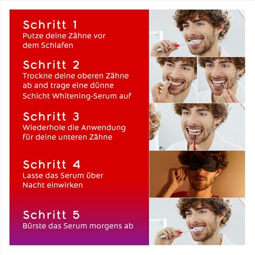 1. Mitnehmen Sie Ihre Zähne. 2. Abfrottieren Sie Ihre Zähne mittels einem Taschentuch. 3. Befestigen Sie das Serum von oben auf und lassen Sie es 15 Sekunden lang Abfrottieren. 4. Wiederholen Sie den Ablauf zugunsten herab. 5. Die ganze Nacht einwirken lassen und morgens bürsten.