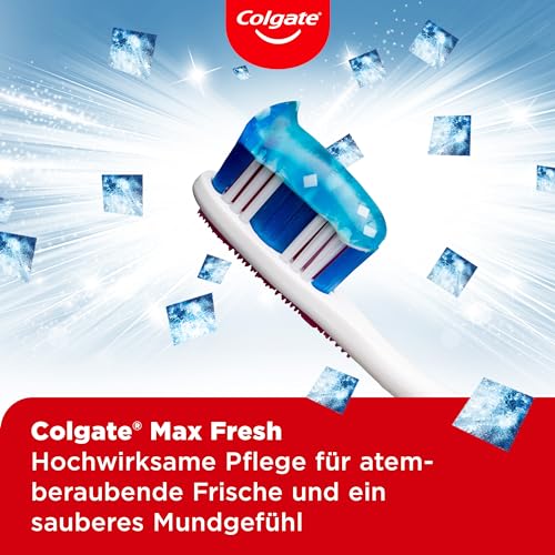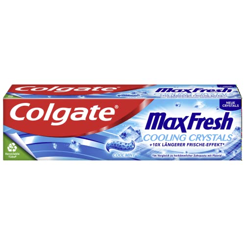 Colgate Max Fresh Cooling Crystals Zahnpasta – für ein unschlagbar frisches Mundgefühl Sorgen um einen schlechten Atem können belastend sein – mit der Colgate Max Fresh Cooling Crystals Zahnpasta sind sie nicht mehr nötig! Die Zahncreme mit leistungsstarker Formel und FreshFX-Technologie enthält kleine Kristalle, die mit jedem Zähneputzen den Mundraum gründlich reinigen und ein atemberaubendes Frischegefühl versorgen – für einen 10x länger anhaltenden Frische-Effekt im Einigung zu herkömmlicher Zahnpasta mit Fluorid.