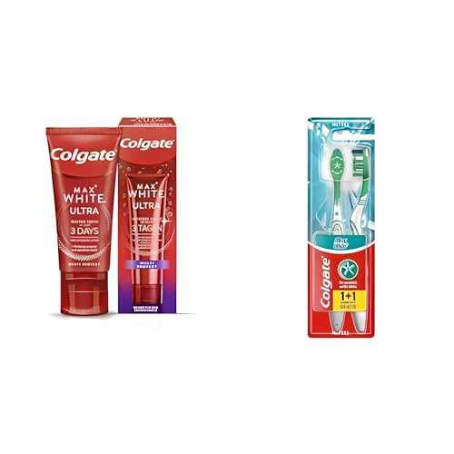 Für deine Whitening – Routine zu Hause – Colgate Max White Ultra Multi Protect Zahnpasta. Freue dich über weißere Zähne in 3 Tagen* dank der Formel mit sauerstoffangereicherten Tiefenwirkung. Diese dringt auf sichere Weise unter die Oberfläche des Zahnschmelzes und entfernt dort die Verfärbungen ebenso wie oberflächlich (* Verfärbungen durch Speisen und Getränke). Zudem verhindert die Formel zukünftige Verfärbungen. Indessen ist die Colgate Max White Ultra Multi-Protect Zahnpasta belastbar für den Zahnschmelz im täglichen Gebrauch. Die Colgate Max White Zahnbürste mit mittelharte Borsten entfernt Mundgeruch verursachende Bakterien. Die Whitening-Borsten befestigen zu einer effektiven Abfuhr der oberflächen Verfärbungen bei und reinigen schwer erreichbare Stellen. Die einzigartige Polierlamellen und die spezielle Borstenstruktur helfen Verfärbungen zu keinen Finger krumm machen. Zudem liegt die Handzahnbürste durch den Anti-Rutsch-Griff optimal in der Hand. Hinweis: Das zahnärztliche Praxisteam empfiehlt, die Zahnbürste alle 3 Monate, nach Infektionskrankheiten sowie nach Abnutzung auszuwechseln. Lieferumfang: 1x 50ml Colgate Max White Ultra Multi-Protect Zahncreme. Hinweis: Empfohlene Lagerung der Zahnpasta ab einer Temperatur von 15°C.