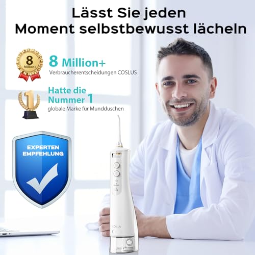 COSLUS Munddusche Kabellos 2025 Upgraded Elektrische Zahnreiniger: 10 Intensitäten & 300ML Wassertank Tragbar Wiederaufladbar Zahndusche Zähne Flosser Wasserdicht Mundduschen für Zuhause Reisen