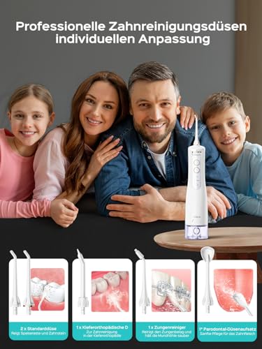 AUFRÜSTUNG AUF DUAL-STREAM-TECHNOLOGIE FÜR VERBESSERTE REINIGUNGSKRAFT: Der Zahnzwischenraumreiniger nutzt die 0,3mm + 0,3mm ultrafeinen Zweistrahl-Wasserdüsen mit einer Impulsfrequenz von 1400-1800 Mal/Min und einem Wasserdruck von 30-150 PSI, um eine einmalige Reinigungsleistung zu bieten und bis zu 3x effizienter Plaque zu entfernen. Die kabellose Munddusche wird mit 2 Modi (Floss, Massage) und 2*Standarddüsen, 1*Zungenreinigunger Düse und 1*Orthodontische Düse, 1*Psrodontale Düse geliefert.