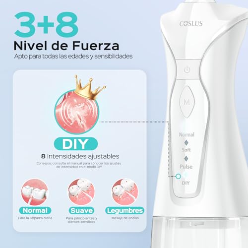 【Verbesserte 4 Modi & 11 Intensitäten DIY-Modus】Die Munddusche Kabellos wurde auf den DIY-Modus mit 8 wählbaren Wasserdrücken umgerüstet, sodass Sie den Reinigungsmodus an den Zustand Ihrer Zähne und Ihres Zahnfleisches adaptieren können, passend für Menschen jeden Alters. Es verfügt außerdem über eine Speicherfunktion zum Aufzeichnen Ihrer Nutzungsgewohnheiten, sodass Sie es beim nächsten Mal problemlos verwenden können, ohne dass wiederholte Anpassungen erforderlich sind.