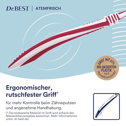 Bakterien sind eine der Hauptursachen für schlechten Atem. Diese Bakterien befinden sich an schwer erreichbaren Stellen, als zwischen den Zähnen und auf der Zunge. Die Dr.BEST Atemfrisch wurde entwickelt, um mit ihrem Zungenreiniger sanft und gründlich Bakterienvon der Zungenoberfläche zu entfernenund hilft so, schlechten Atem vorzubeugen*. Mit ihren längeren X-Spiralborsten ermöglicht sie eine bessere Reinigung der Zahnzwischenräume**. * Abschirmung vor schlechtem Atem ist vorübergehend ** in Labortests, verglichen mit einer herkömmlichen Zahnbürste mit Flachschnitt