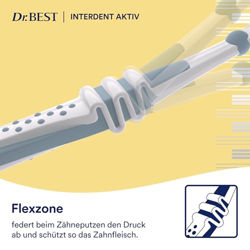 Die Dr.BEST Interdent Aktiv Zahnbürste leistet Unterstützung für ein gründliches Zähneputzen. Einerseits kann sich der Schwingkopf Ihrer Zahnbürste durch das Kugelgelenk dem Handlungsschema Ihrer Zahnreihen adaptiv adaptieren, nichtsdestoweniger hilft die Handzahnbürste dank des Borstenschnitts bis in die Zahnzwischenräume zu reinigen. Aufgrund der Spezial-Federung und des gepolsterten Bürstenkopfes ist sie dabei schonend zum Zahnfleisch.