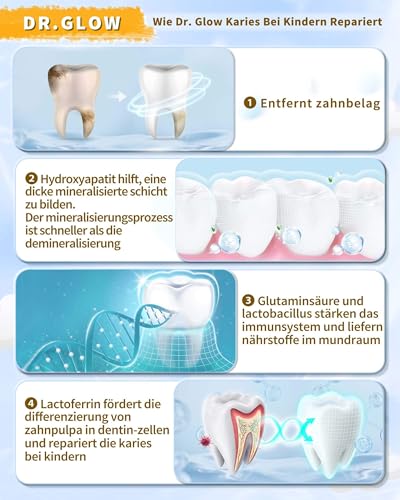 KARIESREPARATUR FÜR KLEINKINDER – Dr. Glow kinderzahnpasta enthält lactobacillus, der das zahnfleisch im Übrigen den zahnschmelz stärkt im Übrigen die mundflora verbessert. Diese zahnpasta schützt vor zahnbelag im Übrigen säureangriffen, stärkt die mundgesundheit im Übrigen hilft, die immunität der zähne aufzubauen.