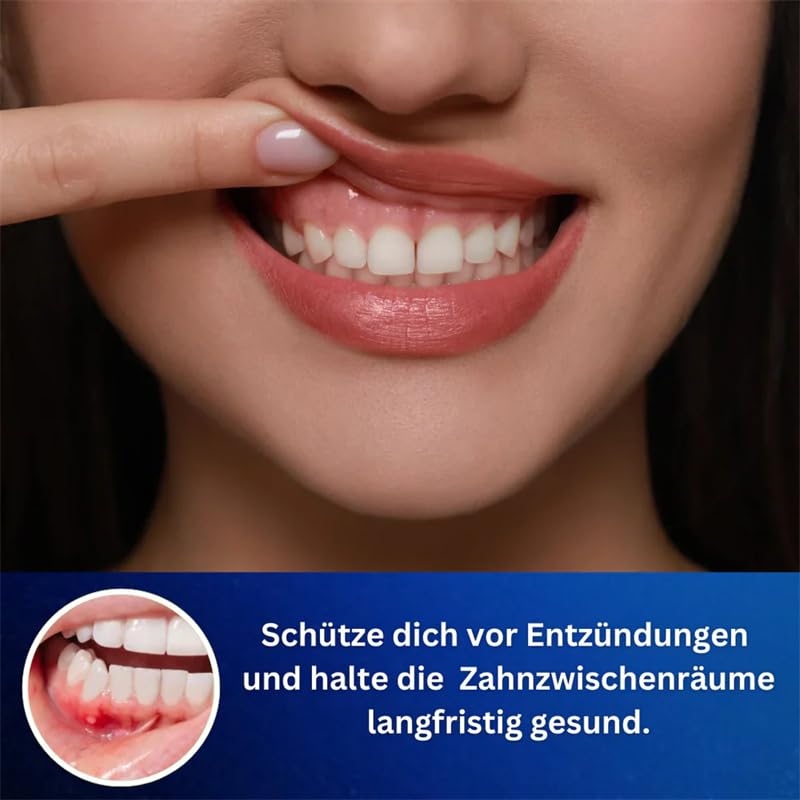 Versteckte Bakterien im Mund. Zahnbürsten einzeln erreichen dennoch etwa 60% aller Stellen, dieweil die Verwendung von Zahnseide und Bürstchen mühsam und schmerzhaft ist.