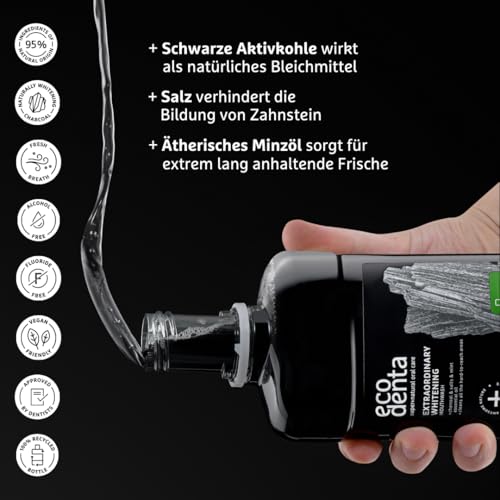 So cool.Die durchsichtige Mundspülung färbt sich beim Schütteln schwarz.Erheben-Kohle + Salze + ätherisches Minzöl verleihen dem außergewöhnlichen Produkt besonders langanhaltende Frische und schützen zudem gegen Plaque.Die grandiose Formel hellt sogar Ihre Zähne auf.*Für noch bessere Resultate verwenden Sie die Mundspülung zusammen mit Schwarzer Zahnaufhellungs-Creme von ECODENTA.Verwendung: Flasche kräftig schütteln.Sanft zusammendrücken bis der Flüssigkeitsspender besoffen ist.Direkt allesamt dem Abwickeleinrichtung verwenden.*Danach Mund gründlich mit Wasser abwaschen.