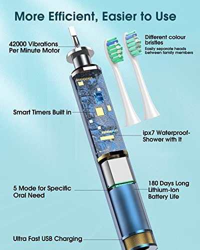 Elektrische Zahnbürste für Erwachsene mit 6 Bürstenköpfen, wiederaufladbare Schallzahnbürste, ultra-lange Akkulaufzeit, 4 Stunden Ladezeit und 180 Tage Nutzung, blau