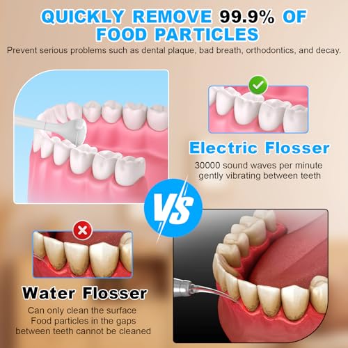 【Elektrische Zahnseide】Diese elektrische Zahnseide wird wie traditionelle Zahnseide verwendet, ohne zusätzliche Lernkosten. Es kann 99% der Lebensmittelpartikel effektiv abtrennen und so ernsthafte Probleme wie Plaque, Mundgeruch, Kieferorthopädie und Karies vermeiden.