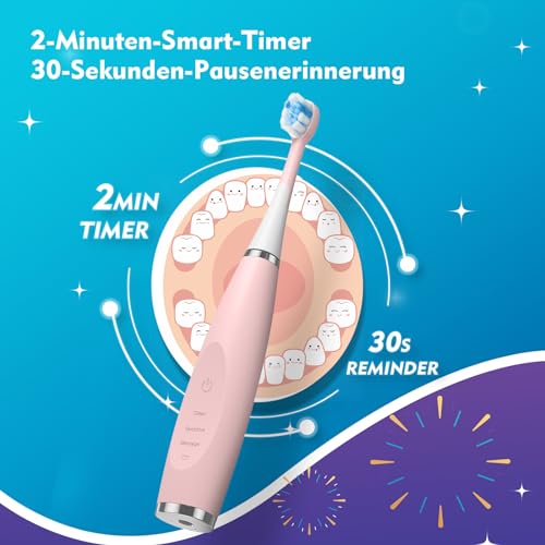 【INTELLIGENTER TIMER & 3 MODI】 Eingebauter intelligenter Timer auf 2 Minuten, vibriert leicht alle 30 Sekunden, um das Abkömmling daran zu erinnern, zu einem anderen Unvollendetes der Zähne zu berichtigen, gründlich ihre Mundhygiene zu reinigen und korrekte Gewohnheiten zu entwickeln. Gleichzeitig verfügt unsere Zahnbürste über 3 Reinigungsmodi mit Speicherfunktion: Reinigen, Sensitiv und Massage. Sie können den richtigen Modus adäquat den Bedürfnissen Ihres Kindes detachieren.