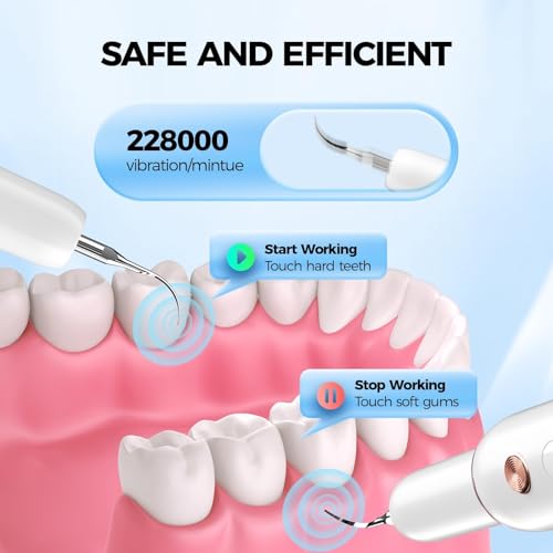 【Intelligenter Zahnfleischschutz】 Diese zahnsteinentferner ultraschall verfügt über ein eingebautes LED-Licht und eine intelligente Erkennungsfunktion zum effektiven Abschirmung des Zahnfleisches. Sie stoppt den Betrieb, wenn sie das Zahnfleisch und die weiche Haut berührt, und beginnt zu vibrieren und zu sich abrackern, wenn sie die Zähne berührt. Das LED-Licht zeigt das Innere Ihrer Zähne ausnehmend und erleichtert Ihnen die Reinigung.