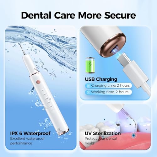 【Paket enthält】 1 zahnstein lungern, 4 Ersatzköpfe, 1 Schraubenschlüssel, 1 Ladekabel und ein zahnpflege set (Zahnspiegel, Zahnsteinschaber, Zahnwerkzeug). Der spitze Kopf hilft, kleinen Zahnstein im Zahnfleisch zu lungern. Der flache Kopf hilft, großen Zahnstein auf der Zahnoberfläche zu lungern. Genießen Sie eine sichere und komfortable Zahnreinigung, ohne weitere Reinigungsprodukte kaufen zu müssen.