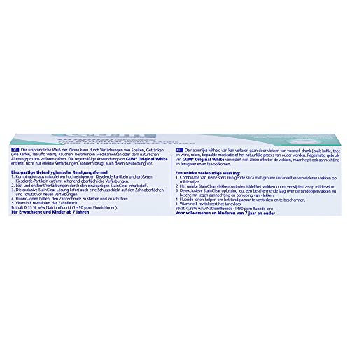 Das ursprüngliche Weiß unserer Zähne verändert sich unter Einsatz von zunehmendem Gefährte, aufgrund bestimmte Nahrungsmittel (zum Beispiel: Kaffee, Tee und Rotwein), Rauchen oder aufgrund Zahnoberfläche verfärbende Medikamente. Eine regelmäßige Verwendung von GUM Original White führt zur Entfernung von Verfärbungen und beugt ihnen vor. GUM Original White Zahnpasta ist frei von aggressiven Bleichmitteln. GUM Original White Zahnpasta beinhaltet feinste Reinigungsperlen, die die Zähne friedfertig abschleifen. Das spezielle Stain Clear System dringt abgrundtief in die Verfärbung ein und löst diese auf. GUM Original White remineralisiert den Zahnschmelz unter Einsatz von 1490 ppm Fluorid.
