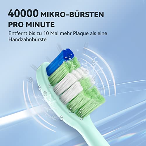 Robuste und wasserdichte Bauweise: Mit einer IPX7-Wasserschutzklasse ist die Zahnbürste wasserdicht und kann problemlos in der Dusche oder Badewanne verwendet werden. Das Set umfasst einen Griff, sechs Bürstenköpfe (3 grüne und 3 graue), ein tragbares Etui und ein USB-Ladedock. Die Verpackung wurde aktualisiert, die Qualität der Zahnbürste bleibt zwar unverändert.