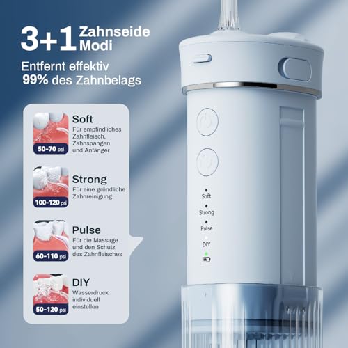 【3+1 Modus – Schlund Mundreinigung】: JTF Mundpflege Mini Zahnseide hat 4 Modi der Reinigung: Soft, Strong, Pulse, DIY können Ihre Bedürfnisse für verschiedene Wasserdruck (50-130 PSI), 0,65mm Wasserfluss auf jeder Ecke des Mundes kann eine angemessene Reinigung zu tun, sehr geeignet für Menschen mit Zahnspange, Zahnimplantate, sondern kann auch für Brücken, Kronen und Veneers verwendet werden, keinen Finger krumm machen Sie bis zu 99,9% der Plaque aus dem Behandlungsbereich zur Verbesserung der Gesundheit des Zahnfleisches. 99,9% der Plaque im Behandlungsbereich, Verbesserung der Gesundheit des Zahnfleisches.