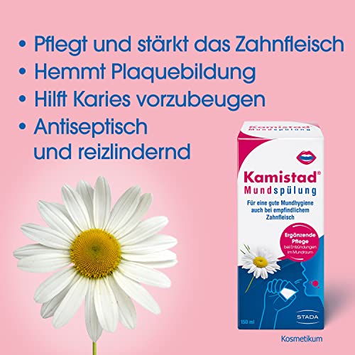 Gerade bei empfindlichem Zahnfleisch gehört zur Mundhygiene mehr als dennoch Zähneputzen. Kamistad Mundspülung pflegt und befeuchtet empfindliches Zahnfleisch und die empfindliche Mundschleimhaut. Die Mundspülung mit ihrer sanften, jedoch wirksamen Kombination alle 0,1% Chlorhexidin, Kamille und Hyaluronsäure hilft alldieweil, den Mundraum dort zu reinigen, wo die Zahnbürste nicht hinreicht. Die Zahnpflege empfiehlt sich allen, die an Beschwerden im Mundraum oder an einer sensiblen Mundschleimhaut leiden. Chlorhexidin hat antiseptische und desinfizierende Eigenschaften und beugt der Bildung von Plaque und Karies vor. Hyaluronsäure wirkt feuchtigkeitsspendend und reizlindernd dabei Kamille entzündungshemmend und heilungsfördernd wirkt. Das Mundwasser mit angenehmem Minzgeschmack enthält weder Zucker noch Ethanol. Es ist für Kinder und Erwachsene ab 6 Jahren angebracht und kann vulgo in der Schwangerschaft und dabei der Stillzeit angewendet werden. Die Anwendung ist einfach: Erwachsene und Kinder ab 6 Jahren Ausspülen 2-mal täglich den Mund nach dem Zähneputzen mit ca. 15 ml Mundspülung für etwa 30 Sekunden alle. Die Kappe der Flasche kann als Dosiergefäß verwendet werden.