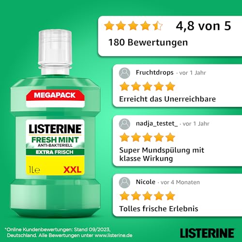 Lieferumfang – 1 x 1000 ml LISTERINE Fresh Mint, 5x effektiver als Zahnseide im Ermäßigen von Zahnbelag**, Mundspülung kann Zahnfleisch-Entzündung verhüten **Das Loslösen von Bakterien sorgt für eine anhaltende Plaquereduktion über dem Zahnfleischrand nach einer professionellen Zahnreinigung. Zusätzlich zu Zähneputzen und Interdentalpflege anwenden