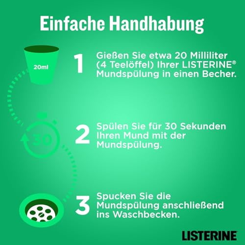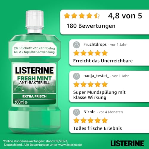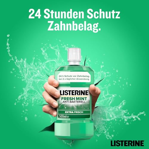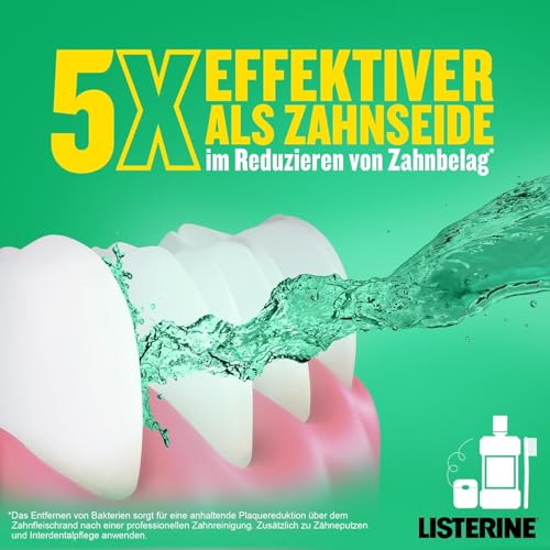 Lieferumfang – 1 x 500 ml LISTERINE Fresh Mint, 5x effektiver als Zahnseide im Vermindern von Zahnbelag**, Mundspülung kann Zahnfleisch-Entzündung umschiffen **Das Trennen von Bakterien sorgt für eine anhaltende Plaquereduktion über dem Zahnfleischrand nach einer professionellen Zahnreinigung. Zusätzlich zu Zähneputzen und Interdentalpflege anwenden