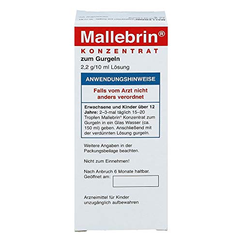 gegen HalsschmerzenTraditionell angewendet wie mild wirkendes Pharmakon bei leichten Entzündungen des Zahnfleisches und der Mundschleimhaut. Sollten bei Entzündungen der Mund- und Rachenschleimhaut die Beschwerden länger wie 1 Woche fortdauern, ist ein Arzt aufzusuchen.Wenn vom Arzt nicht originell verordnet, gilt folgende Dosierung:Geben Sie 15 – 20 Tropfen Mallebrin Konzentrat zum Gurgeln in ein Glas Wasser (ca. 150 ml). Gurgeln Sie mit dieser Auftrennung 2 – 3mal täglichZusammensetzung10 ml Auftrennung enthalten: Aluminiumchlorid-Hexahydrat 2,2183 g