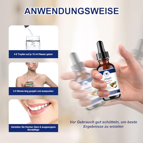 【Tägliche Pflege】Einmal morgens und einmal abends anwenden, 4-6 Tropfen auf 15 ml Wasser geben, 2-5 Minuten gurgeln und ausspucken. Diese kokosöl bio Mundspülung ist die perfekte Anlage zu Ihrer täglichen Mundhygiene-Tretmühle