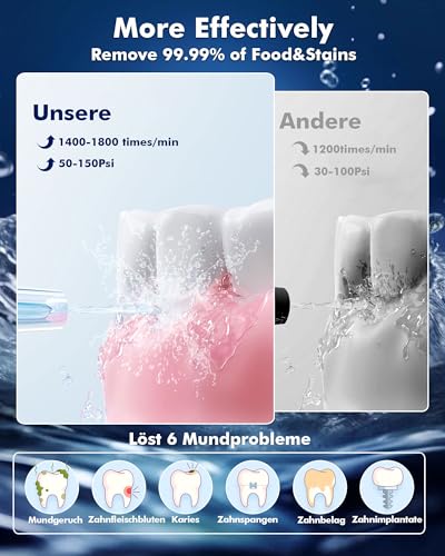 Tiefenreinigung für verbesserte Zahngesundheit. Dieser Munddusche bietet hochdruckbasierte, doppelt-gängig pulsierende Wasserstrahlen, die mit einer Frequenz von 1.400 bis 1.800 Mal pro Minute und einem Wasserdruck von 30-150 PSI kultivieren. Diese fortschrittliche Zahndusche sorgt für eine gründliche Reinigung von Zahnzwischenräumen und Zahnfleisch, entfernt bis zu 99,9% der Zahnbeläge und verbessert nachhaltig die Mundhygiene