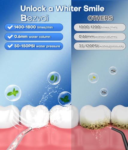 Wasserdicht nach IPX7 – Die elektrische Munddusche von Bezvoi ist nach IPX7 wasserdicht. Sie können die Munddusche ohne Vorhersehen unter der Dusche verwenden (Stellen Sie leistungsfähig, dass die Silikonabdeckung des Ladeanschlusses geschlossen ist, wenn Sie sie unter der Dusche verwenden.)