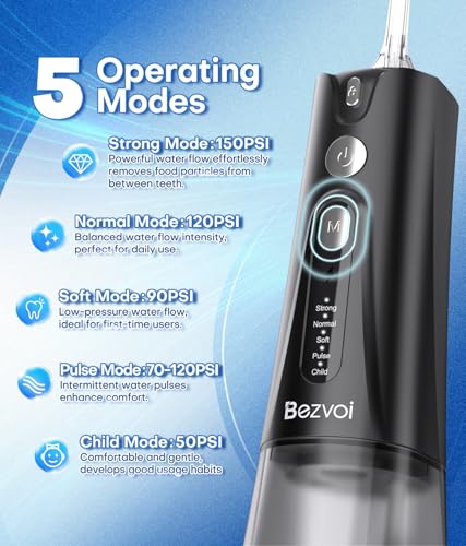 5 Modi für unterschiedliche Reinigungsoptionen – Die kabellose Munddusche verfügt über 5 Modi mit 5 Druckstufen (Starker Modus – 150 PSI, Normaler Modus – 120 PSI, Sanfter Modus – 90 PSI, Pulsmodus – 70–120 PSI und Kindermodus – 50 PSI). Sie ist ideal für Benutzer, die sowohl eine sanfte als auch eine gründliche, kraftvolle Reinigung wünschen (Erstbenutzern empfehlen wir, mit dem Kindermodus zu beginnen und schrittweise zu anderen Modi überzugehen.)