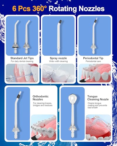 360° drehbare Düse, 6 Ersatzspitzen – Sorgen Sie sich, dass Sie die Düse nicht drehen oder in eine Richtung fixiert werden? Keine Sorge! Diese Wasserflosser verfügt über eine um 360° drehbare Düse, mit der Sie den Winkel einstellen können, um schwer zugängliche Stellen zu reinigen und die Reinigungskraft zu berichtigen
