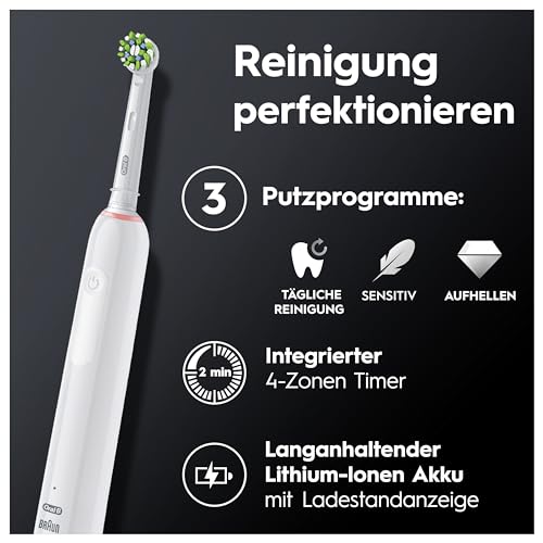 Die elektrische Zahnbürste Oral-B Pro 3 hilft Ihnen so zu abstauben, denn es Ihr Zahnarzt empfiehlt. Der Timer hilft, Ihre Zähne 2 Minuten lang zu abstauben und benachrichtigt Sie jeglicher 30 Sekunden, den Putzbereich zu novellieren. Der runde Bürstenkopf entfernt bis zu 100% mehr Plaque denn eine herkömmliche Handzahnbürste und sorgt an Stelle gesünderes Zahnfleisch. Die 360°-Andruckkontrolle leuchtet rot auf und reduziert die Putzgeschwindigkeit, wenn Sie zu fest abstauben.