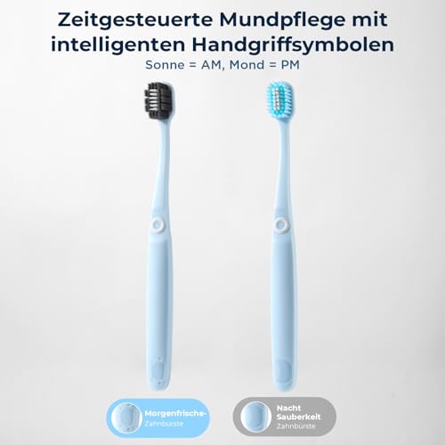 Hygienisches 6er-Set mit individueller Verpackung: Dieses zeitgesteuerte Zahnbürsten-Set enthält 3 Morgenfrische-Zahnbürsten und 3 Nachtpflege-Zahnbürsten (Farben können modifizieren) – ideal für eine vollständige tägliche Mundpflege. Intelligente Symbol-Codierung: Sonne = AM, Mond = PM – keine Verwechslung mehr bei der Routine. Austauschen Sie die Bürsten alle 3 Monate und schlussfolgern Sie sie mit unserem Aluminium-Zahnbürstenetui für eine organisierte Aufbewahrung