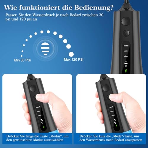 Umfassende Zahn Reinigen: Unser smart kabellose tooth waterjet machine bietet drei Reinigungs modi: Normalmodus für einen stabilen Wasserstrahl zur täglichen zahnreinigung und Abfuhr von Speiseresten und Zahnbelag; Punktmodus für konzentrierten, hochdruck Wasserstrahl zur gründlichen Reinigung von zahnzwischenraum und Zahnfleischlinien; Pulsmodus für intermittierende Wasserstöße zur Massage des Zahnfleisches. Die 360-Grad-Drehdüse sorgt für eine umfassende, komfortable Reinigung.