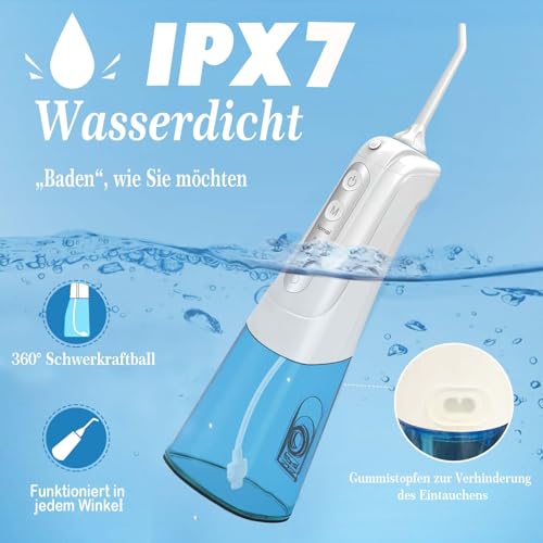 Vielseitige Munddusche: Ausgestattet mit Düsen, passt dieser elektrischer water pick perfekt für Ihre Mundpflege, ob zu Hause oder unterwegs. Der Wassertank ist abnehmbar und bietet genug Volumen für eine gründliche Reinigung. Sie haben zwei Befüllmöglichkeiten: Entweder abnehmbar oder durch den Füllanschluss. Das Anlage ist so konzipiert, dass es aka in feuchten Umgebungen wie Dusche oder Bad bedenkenlos verwendet werden kann.